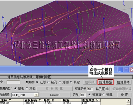 助系统 结合使用,可完成矿山、城市、地下工程、石油、水利等行业的工程三维建模。 三维吉斯三维地理信息系统由三维地理数据库、三维建模图形平台组成。三维立体图形处理与显示功能强大,适合于矿山、城市、地下工程、石油、水利等行业的工程建设三维数据存储、处理分析、三维建模,也适合涉及地理地形的三维漫游建模。 系统的特点:(1)支持DWG格式的图形导入;(2)从图形中采集数据(可采集导入的DWG图中的线条数据到数据库);(3)由数据自动绘制三维立体图;(4)生成的三维立体图可进行任意角度、任意方位的剖切;(5)可导出3dsmax的max和3ds文件格式,用于三维漫游、三维游戏制作平台;(6)可将平面图转换为三维图,三维图也可转换为平面图。(8)与三维工程设计辅助系统 结合使用,可完成矿山、城市、地下工程、石油、水利等行业的工程三维建模。 以煤矿地层三维建模为例,介绍部分功能: 根据钻孔数据自动生成立体钻孔图标和平面钻孔图标,随时可以将钻孔数据与掘进地测数据结合,自动生成或随时更新三维和二维地层底板等高线、顶板等高线、厚度等值线。
