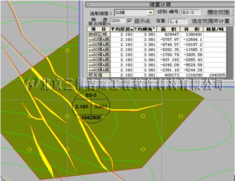 5、任意划定区域进行面积、体积和储量计算;自动计算和去除断层所占用面积、体积和储量; 储量块段图例符号的自动绘制。