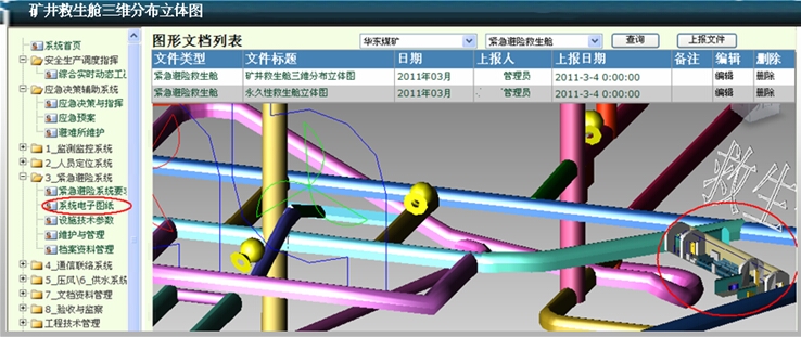 协同管理平台对“六大系统”所有相关的三维、平面图形进行分类管理,如避险硐室、救生舱在矿井中的三维立体分布及其立体图、设计图等,通过平台在浏览器中可直接查询和使用三维图和平面图,不需安装大型图形软件,操作简单、使用方便。
