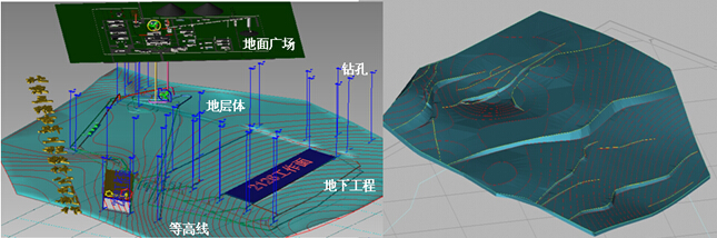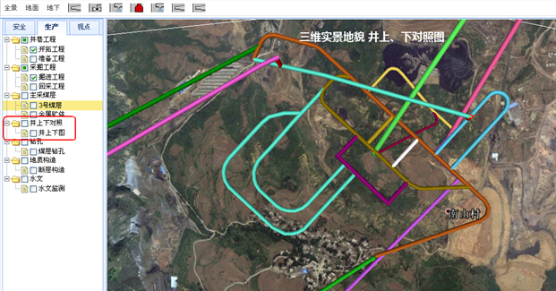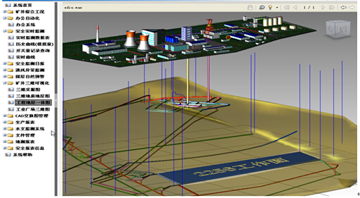 (4)矿区三维全景中直接展现井上下对照立体图;