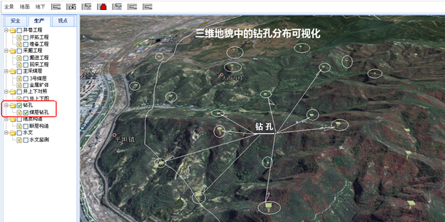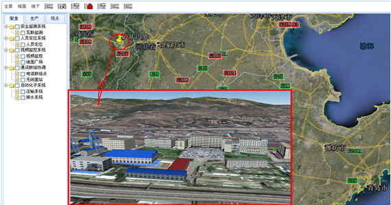 (2)矿区地球定位,在三维地球场景图中定位矿区位置,并可直接漫游聚焦到整个矿区全景或工业广场;
