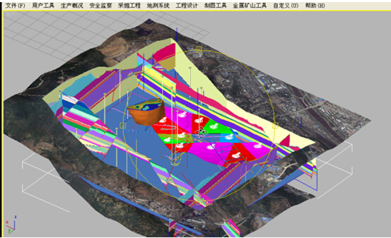 (3)矿区三维全景(含:矿边界内及周围所有三维地形地貌,覆盖卫星图片)的三维自动漫游,以及鼠标控制三维漫游;